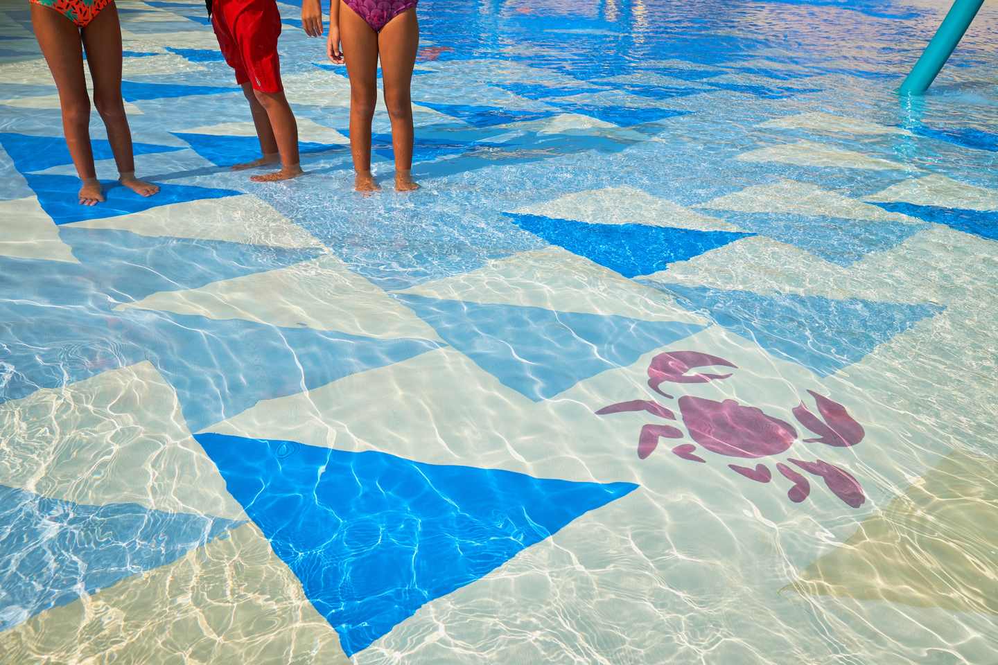 Atlantis the Palm, Dubai was one of the first properties to install a triangle beach gradient that featured distinct zoning principles where shallow areas reflected beach-inspired tan colors and deeper areas of water had gradually darkening blue tones. Beyond the immersive theming this design provides, the effect enhances confident play value by visually signaling to guests that a depth of water is present and giving them a sense of how quickly it deepens.